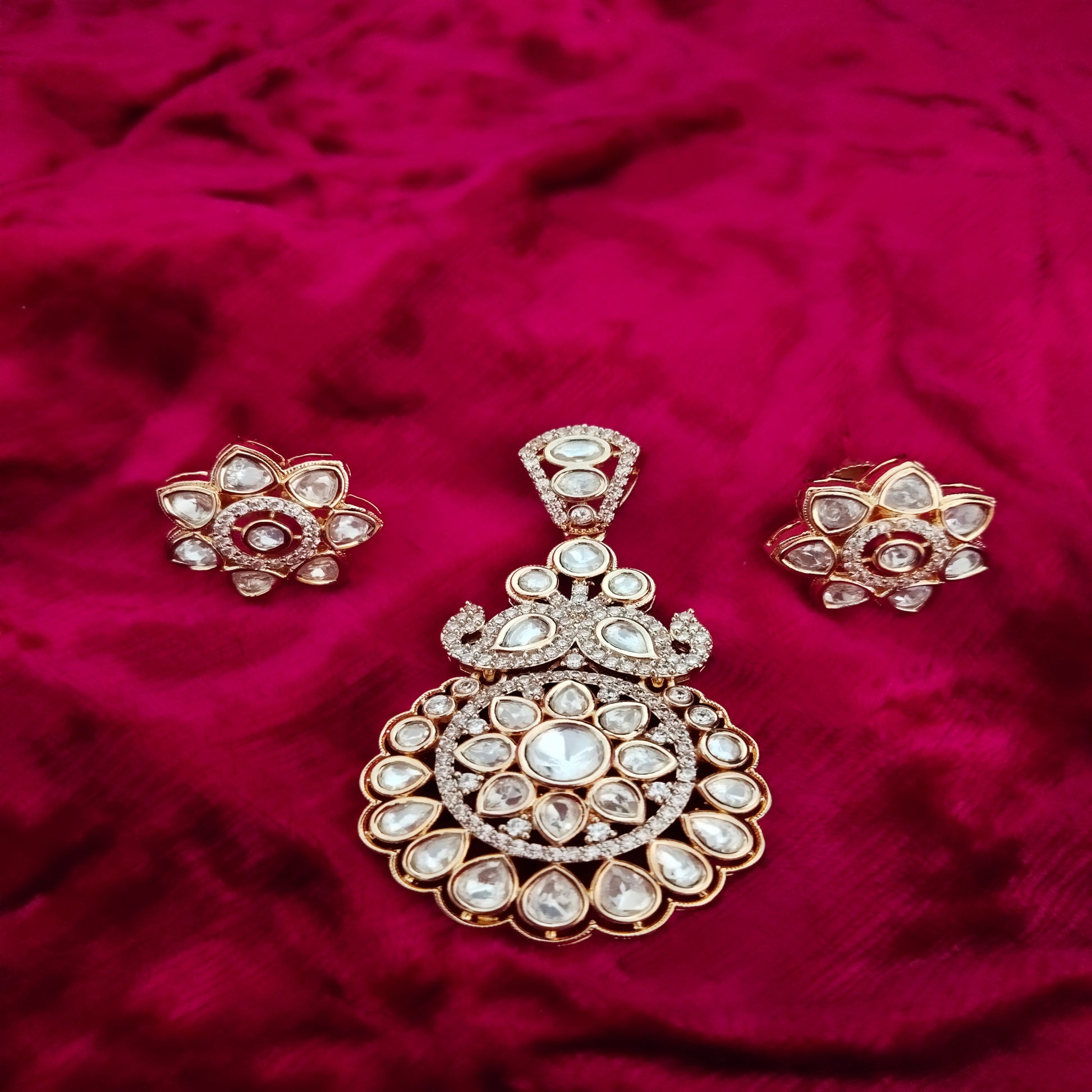 Crafted with precision and finished with rich gold plating, this stunning pendant set brings royal elegance to your festive and ethnic outfits. The sparkling white stones and Polki detailing reflect a real-jewelry look that’s perfect for weddings, functions, and parties.