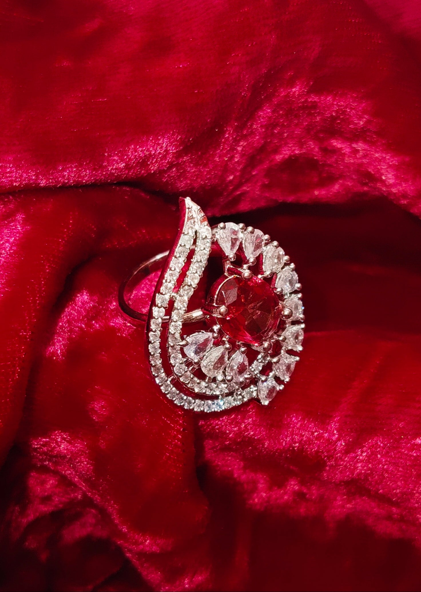 Turn heads with this luxurious red stone statement ring, designed to add sparkle and sophistication to any look. Crafted with a vibrant oval-cut ruby red center stone, surrounded by dazzling American Diamonds in a teardrop halo pattern, this ring blends traditional charm with modern elegance. The unique swirl design enhances its regal feel, making it perfect for weddings, parties, or festive wear.